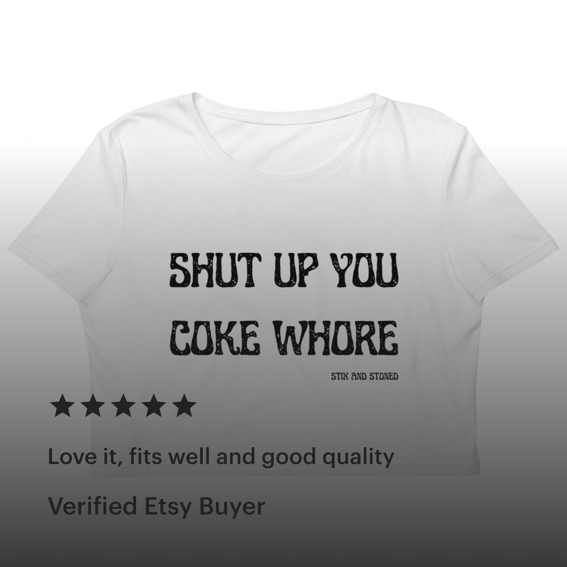 Coke Whore Crop Top | Shut Up You Coke Whore| Funny Graphic Streetwear Tee – Let the Shirt Do the Talking | White Crop Top Shirt