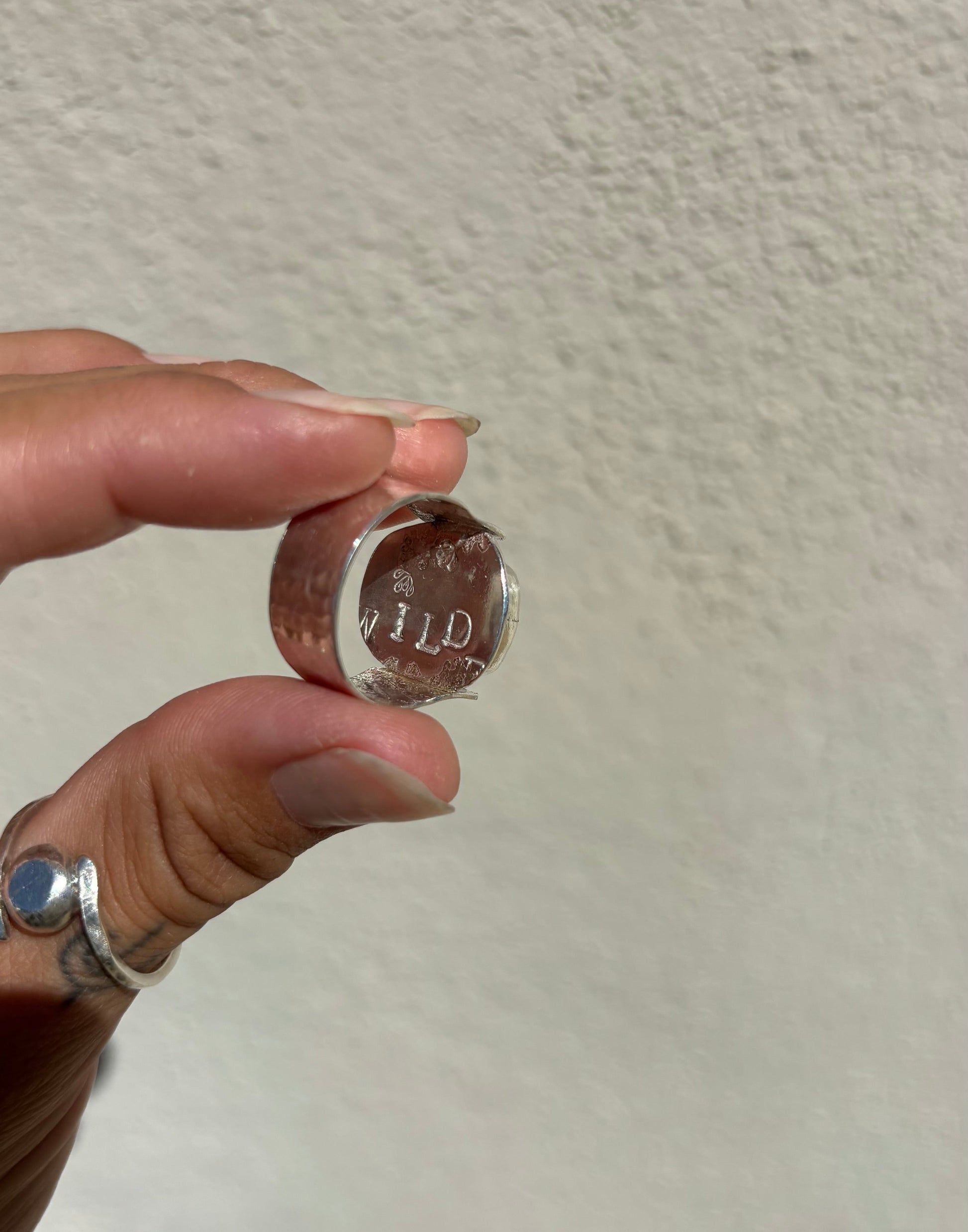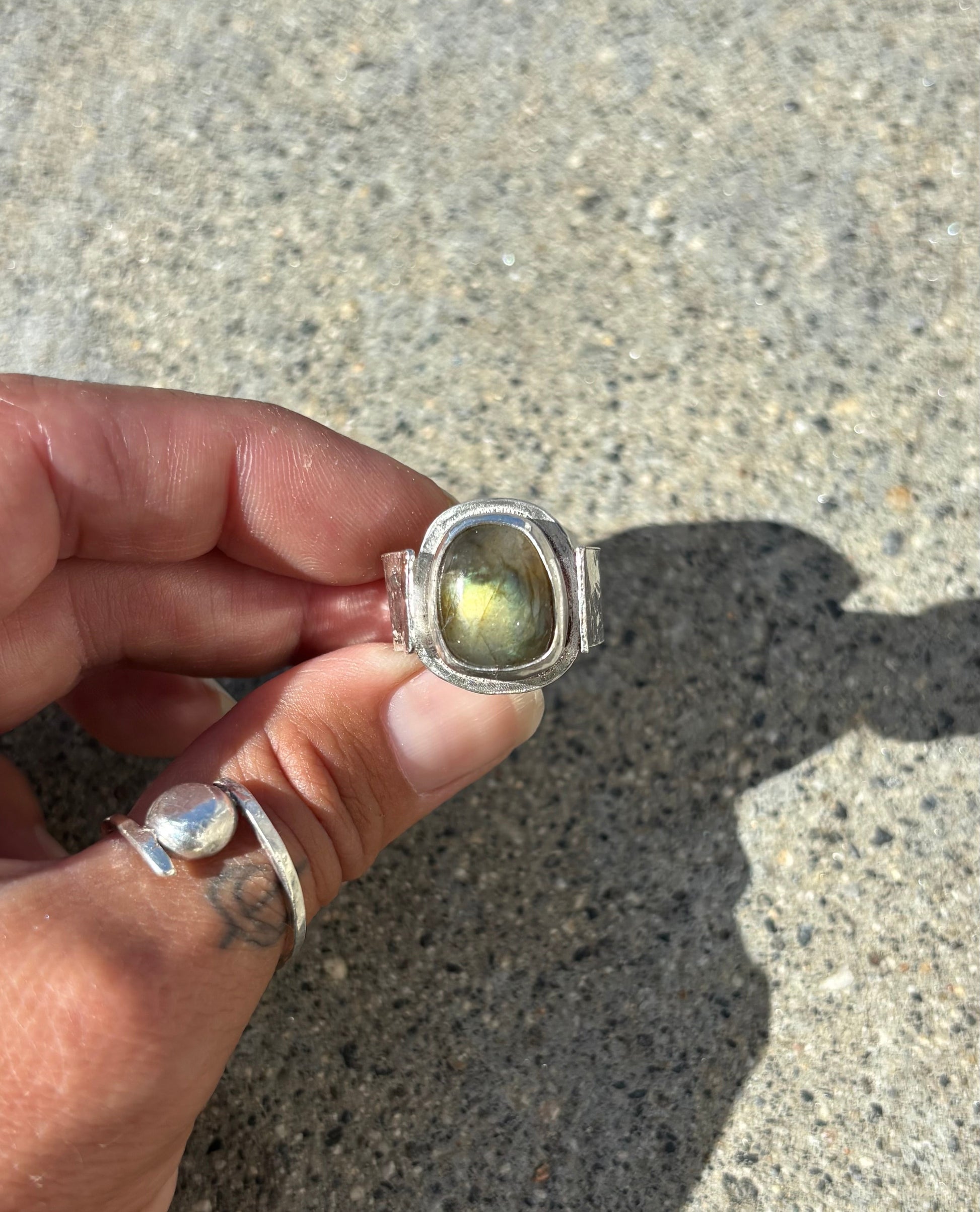 A stunning, one-of-a-kind labradorite gemstone, hand cut and set in a sterling silver bezel and band with a wild earthy stamp pattern on the back. Size 7.