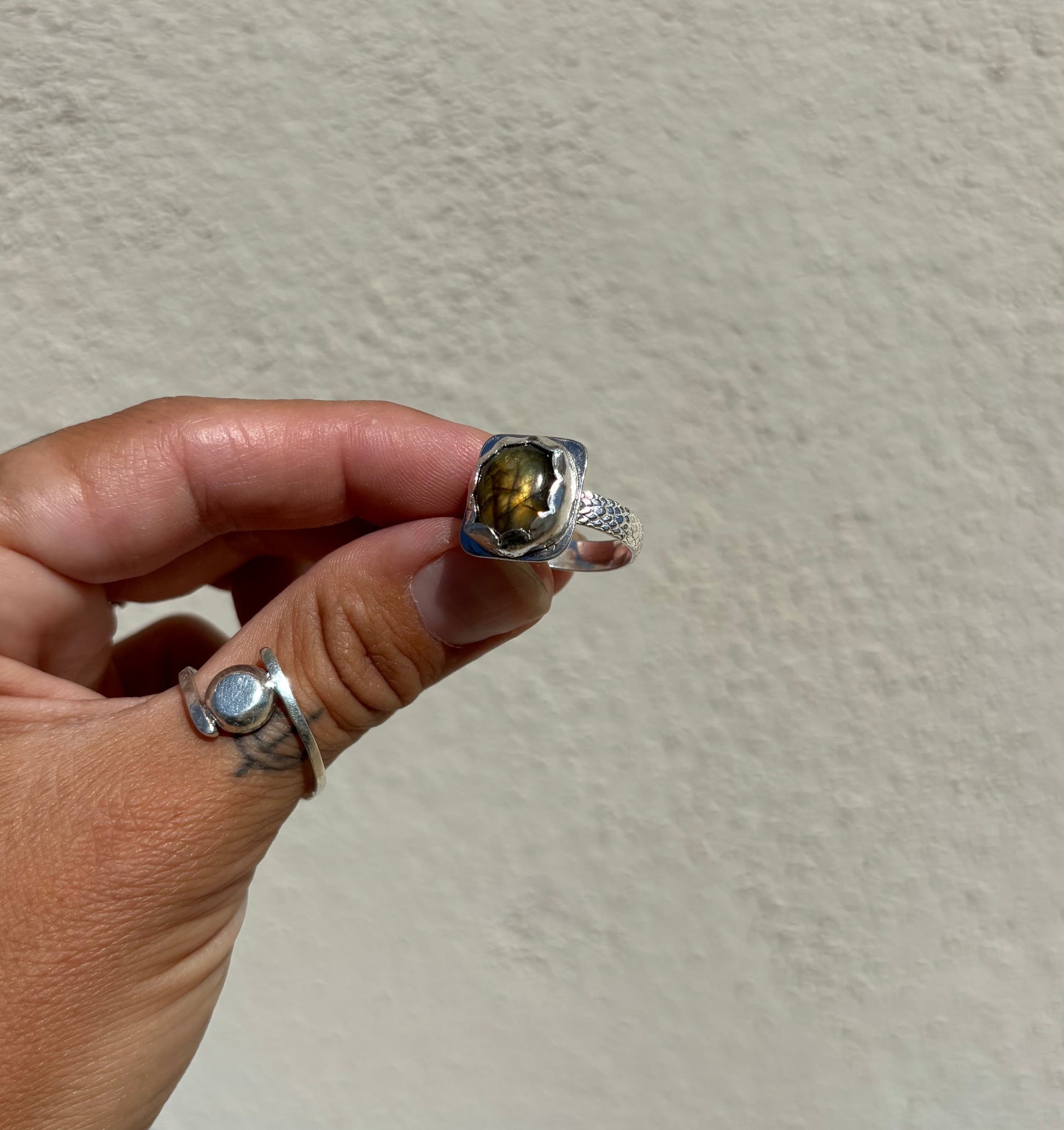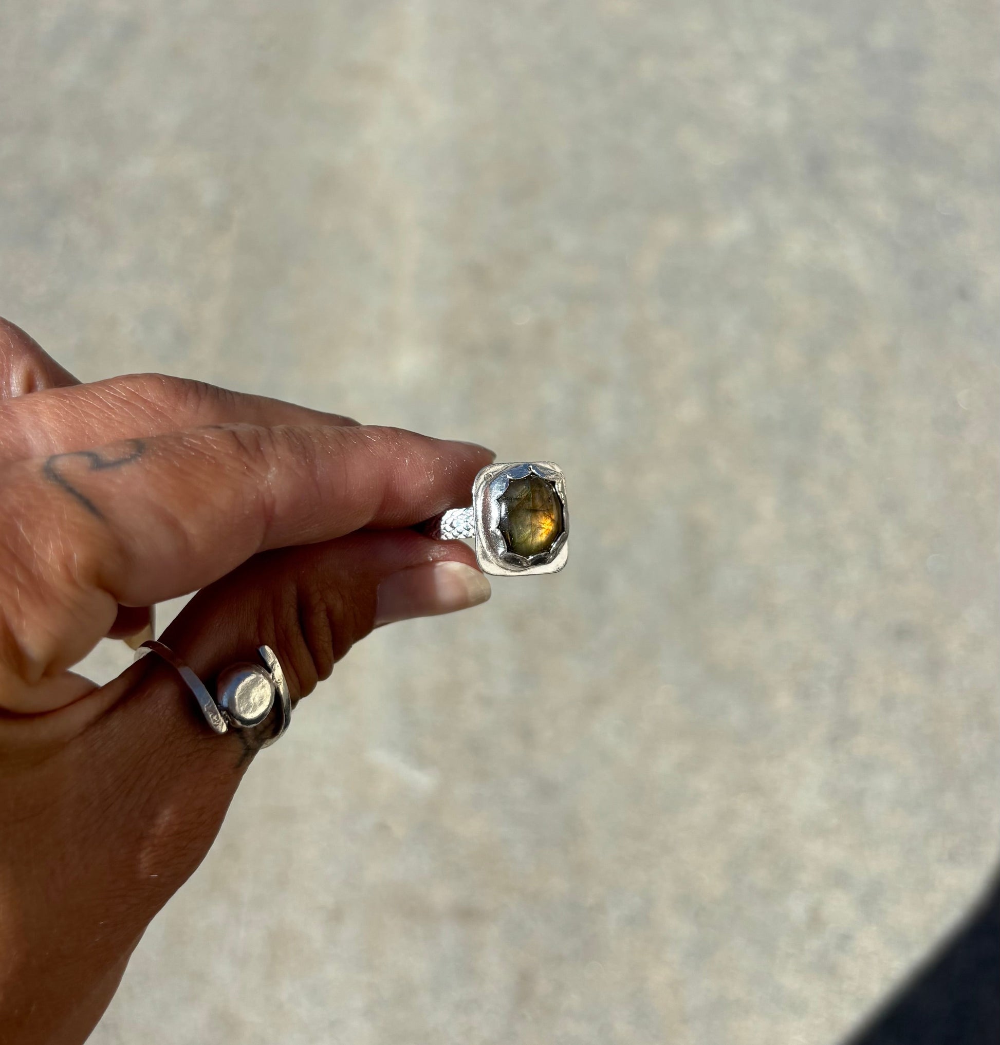 A stunning, one-of-a-kind labradorite gemstone, hand cut and set in a sterling silver bezel and band with a wild earthy stamp pattern on the back. Size 7.25.