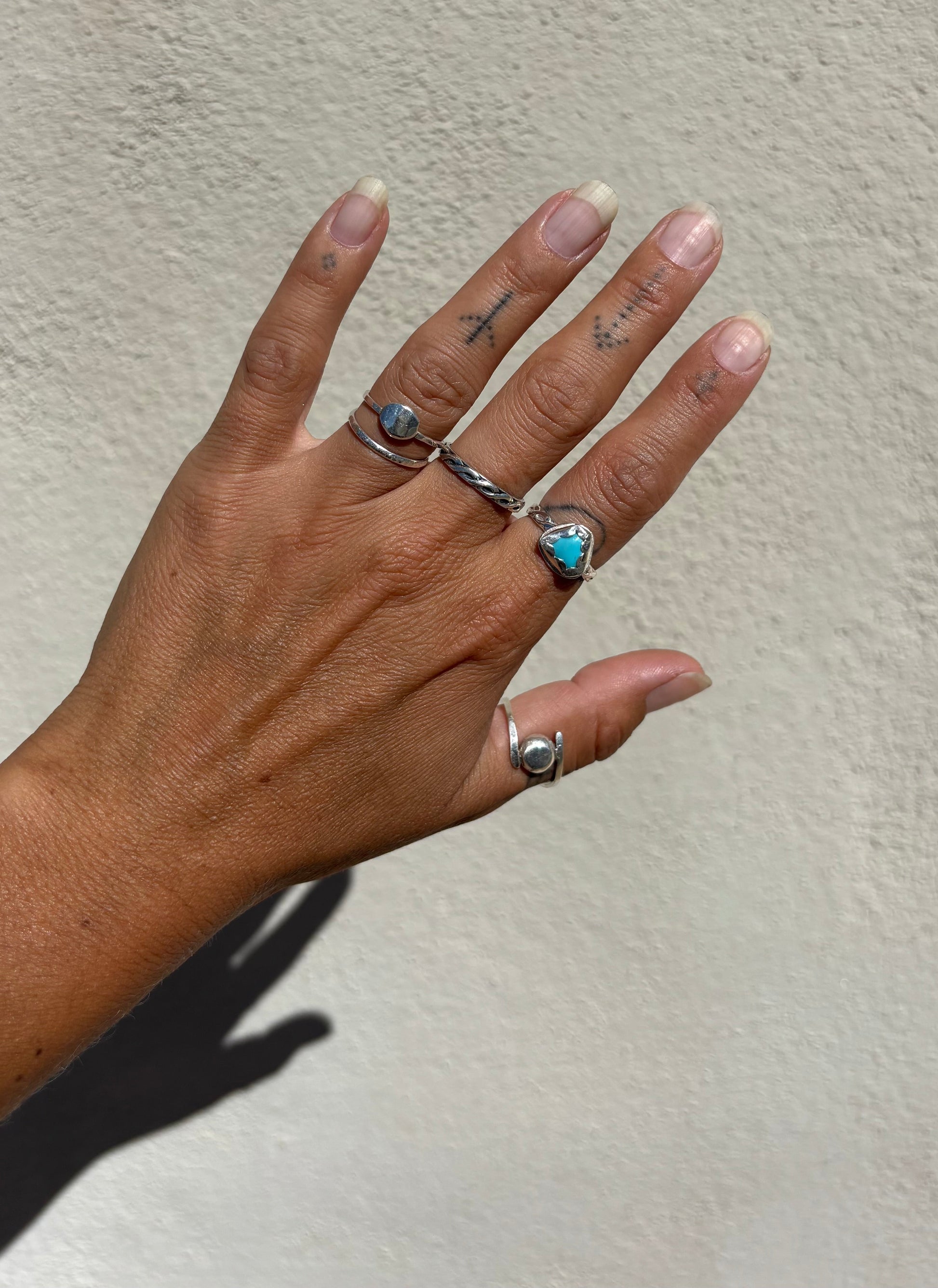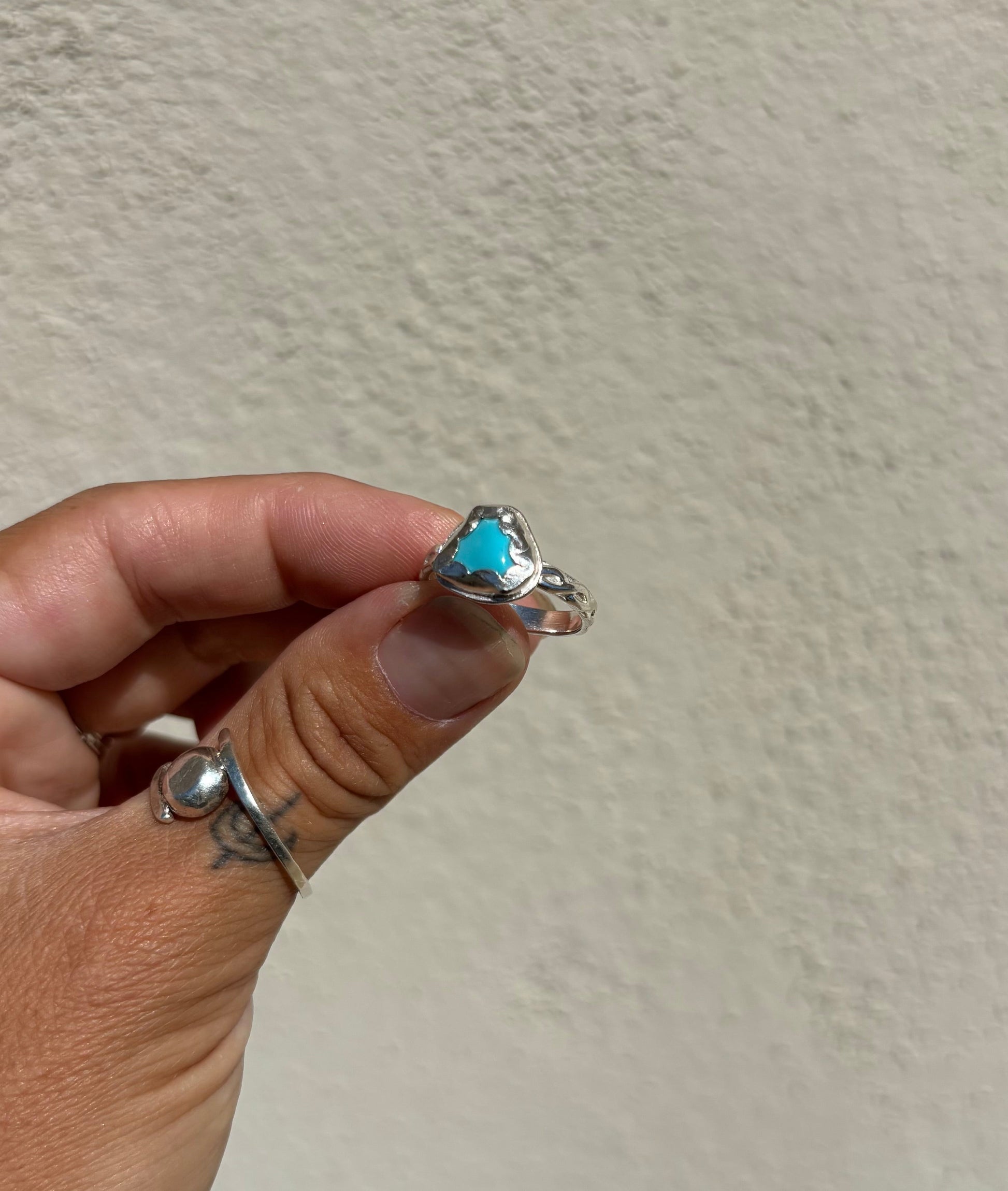 This stunning Turquoise Rope Ring features a vibrant triangle shaped turquoise cabochon, set in a sterling bezel on a silver rope band. Its size 6 makes it the perfect addition to any jewelry collection. Elevate your style with this eye-catching statement piece.