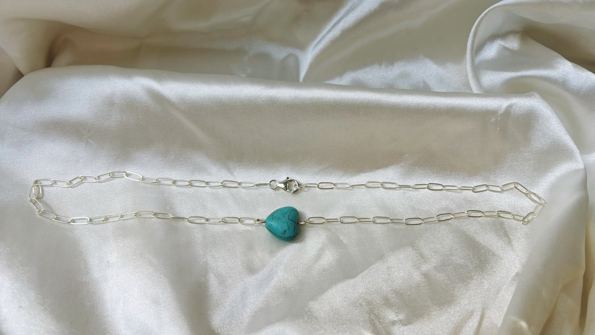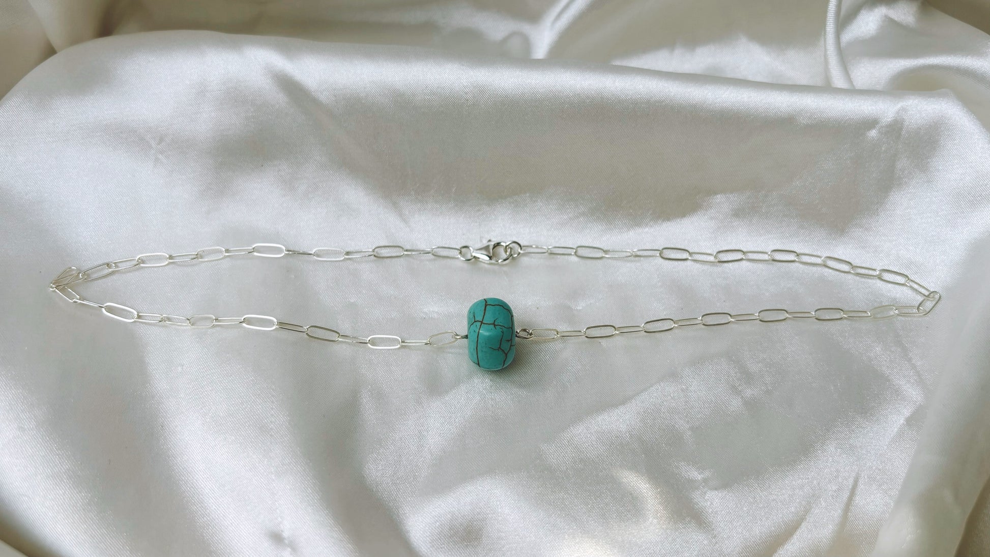 This turquoise bead necklace features a stunning turquoise bead on a 17-inch sterling silver chain in a unique paperclip style. With an adjustable choker length, it can be worn in a variety of ways for a versatile and elegant touch to any outfit. The perfect way to add a statement layer!